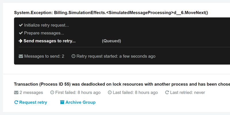 Retry failed messages with a single click, individually or in bulk, and archive any unrecoverable messages so their data remains available for later audit and review.